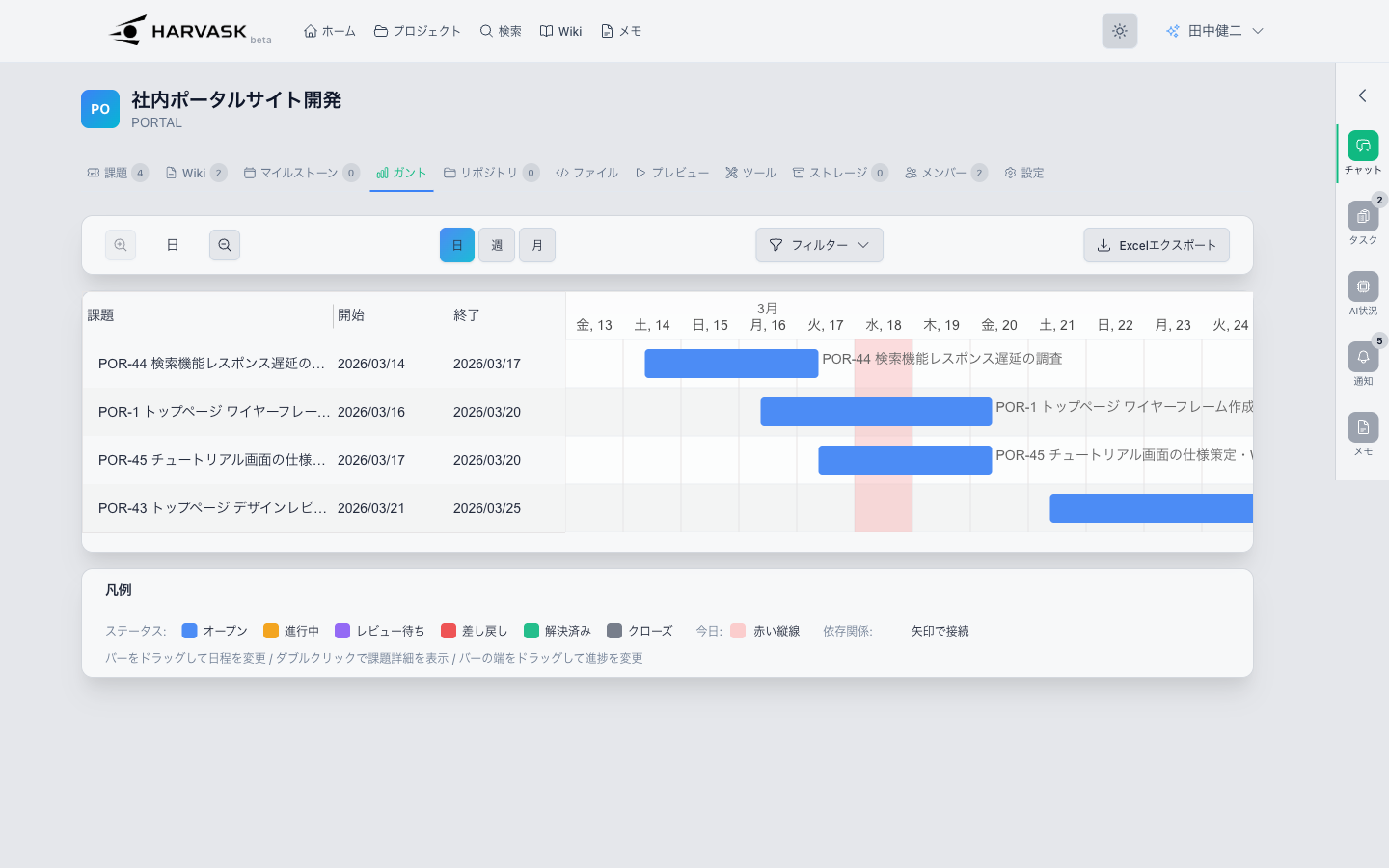プロジェクトのガントチャートで現在のスケジュールを確認します。