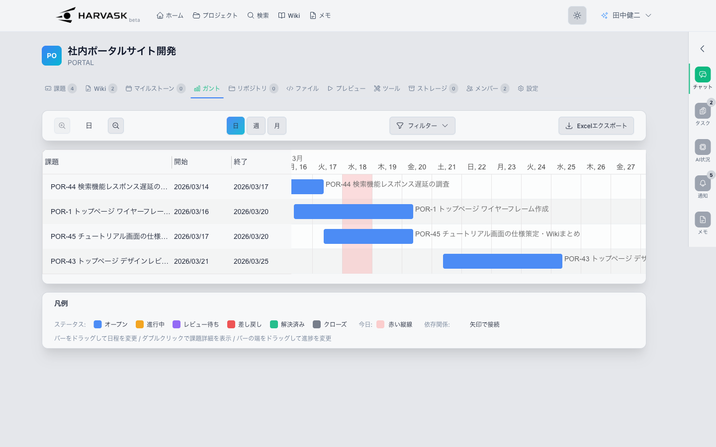 HARVASKなら、AIにリスケの条件を伝えるだけで、依存関係を考慮したスケジュール調整を提案してもらえます。結果はガントチャートで視覚的に確認できます。